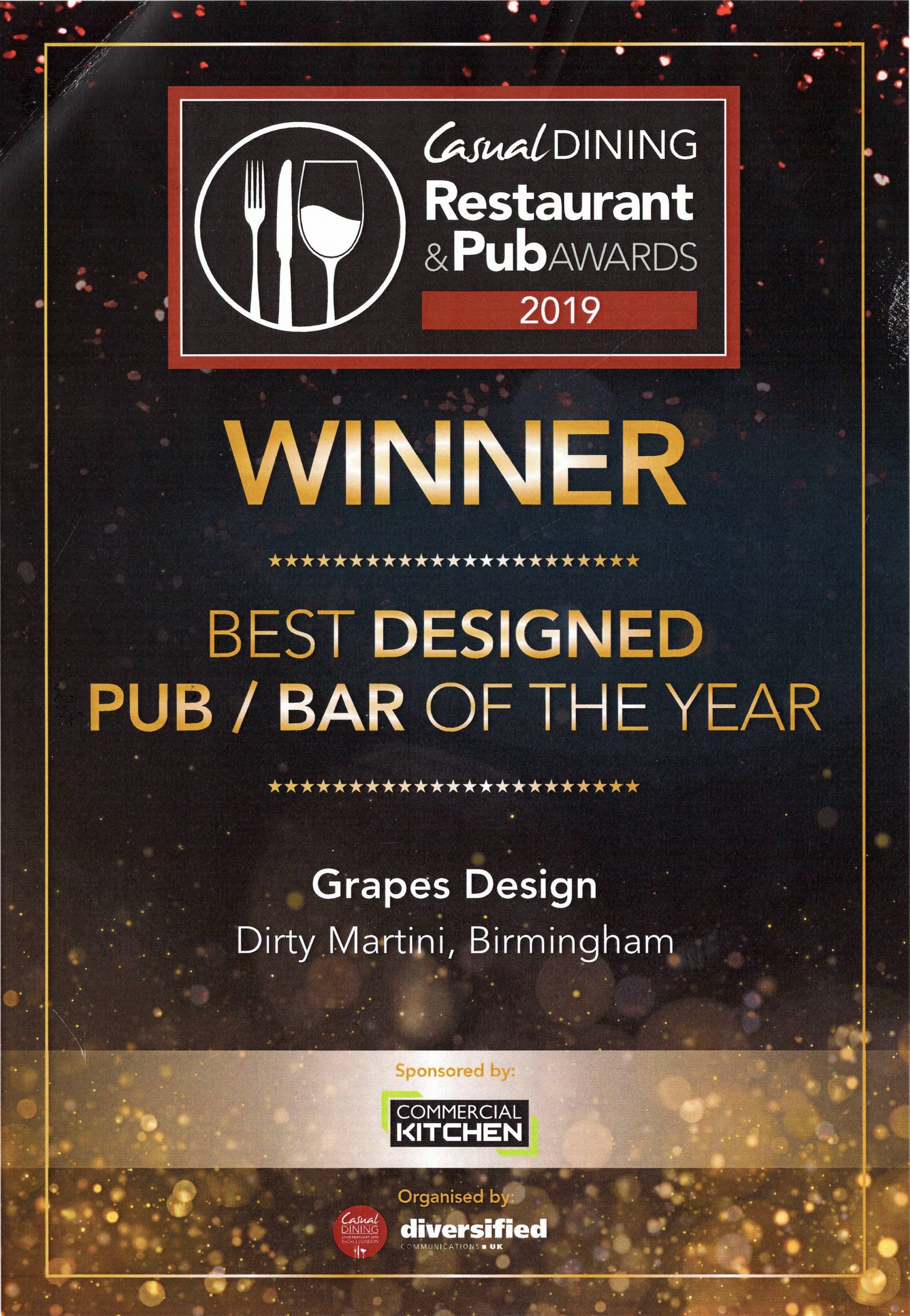 Grapes have been awarded the best designed pub / bar of the year for Dirty Martini, Birmingham at the Casual Dining Awards! A fantastic achievement for a wonderful site which has set the benchmark for the Dirty Martini brand. We look forward to future projects and hopefully many more awards!
