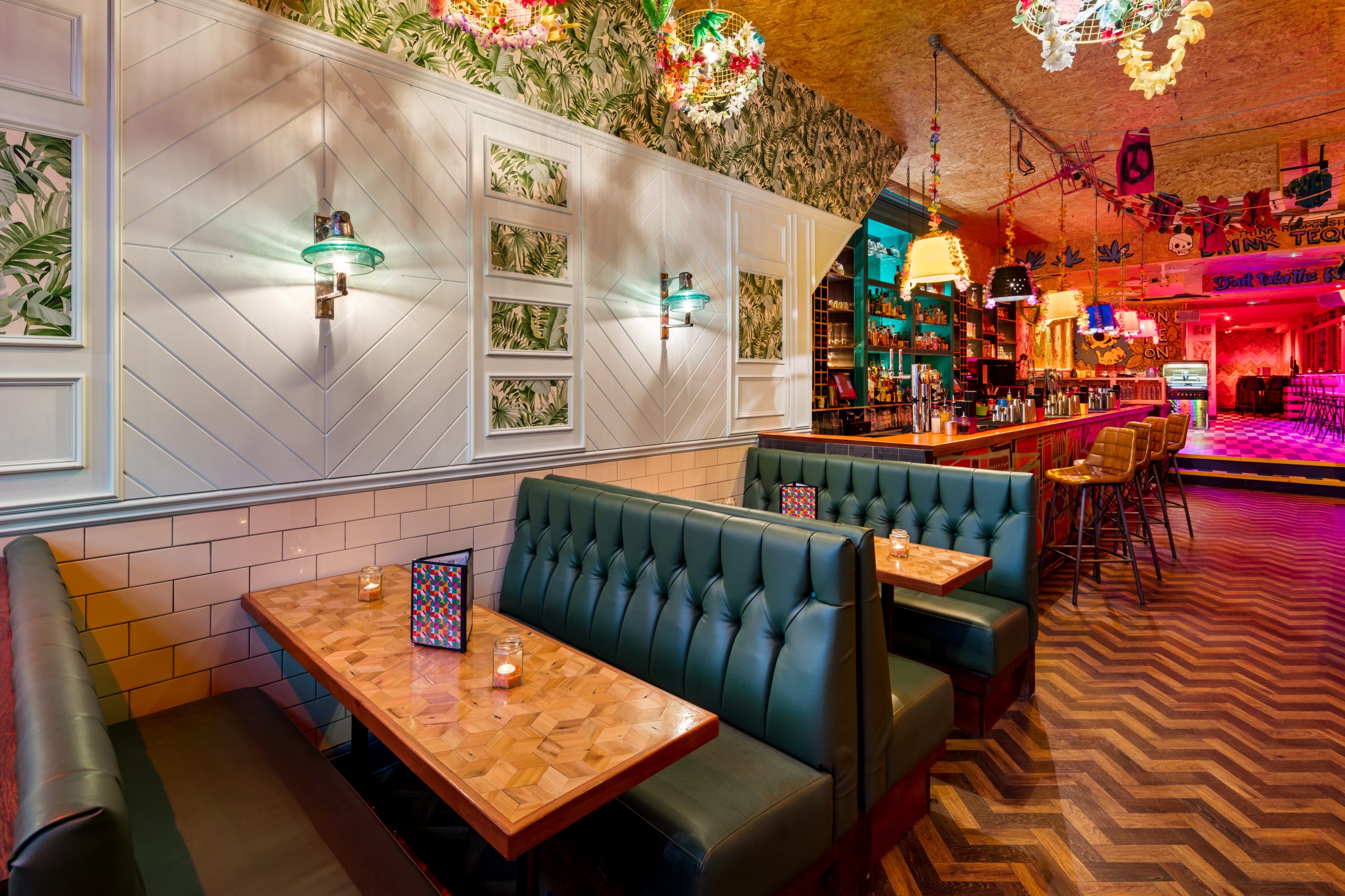 Grapes redesigned the entrance area to Barrio Islington providing a fresh new look with white timber panelling, tropical wallpapers and button backed banquette seating just in time for summer!
