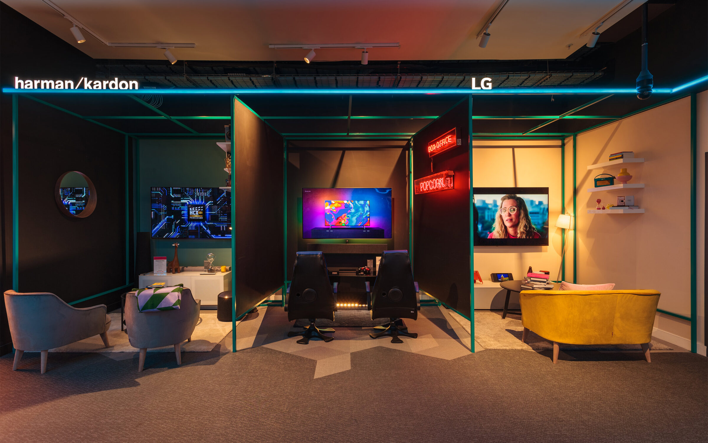 Grapes were selected to design the technology and Audio Visual department ‘Tekzone’ at Selfridges. The main elements were state of the the art home experience areas, a bespoke colour adaptive LED lighting matrix, now synonymous with Tekzone and a central VM area for the Worlds latest tech to shine.